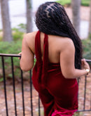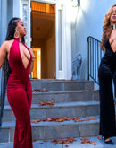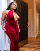 Command attention in our Wine Down Halter Jumpsuit, designed to exude sophistication and allure. Crafted from luxurious velvet fabric, this jumpsuit features a daring halter neckline with a bold, gold-accent buckle detail, a plunging V-cut front, and a backless design for a head-turning silhouette. The wide-leg fit adds elegance and comfort, making it perfect for upscale events, date nights, or any occasion that demands a striking statement.