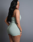 Crafted in a luxe sage green and lavender stretch fabric, it hugs in all the right places while keeping things flirty and fresh. Whether you're styling it with heels and hoops or layering with a cropped jacket, this piece is built to turn heads.