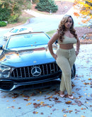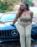 Turn heads with this show-stopping Shimmer Luxe Two-Piece Set! This ensemble features a fitted crop top with adjustable straps and a matching high-waisted pant, both crafted from a soft, stretch knit fabric that sparkles with a golden shimmer. Perfect for special events, date nights, or elevating your everyday style, this set balances comfort with luxury.
